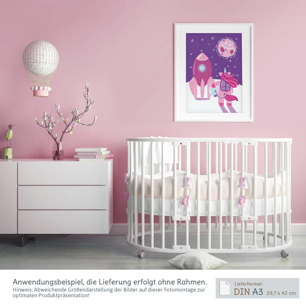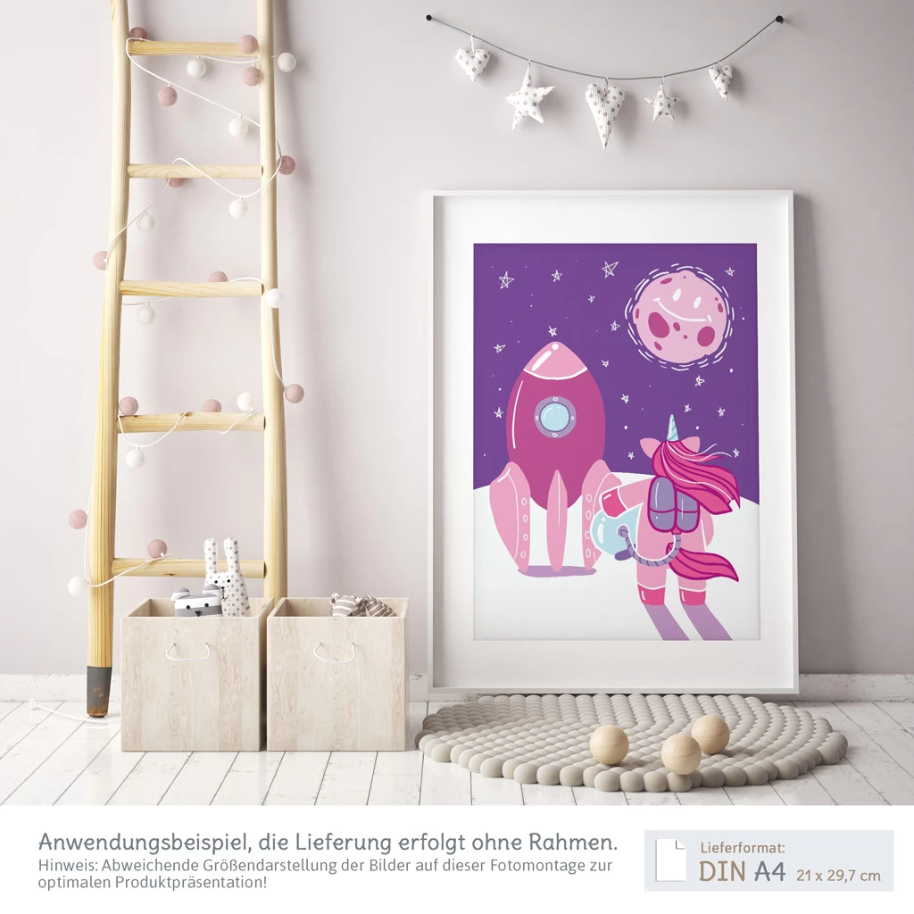- 1x DIN A3 (29,7 x 42 cm) Poster / Kunstdruck Illustration „Einhorn mit Rakete und Mond“ ohne Rahmen