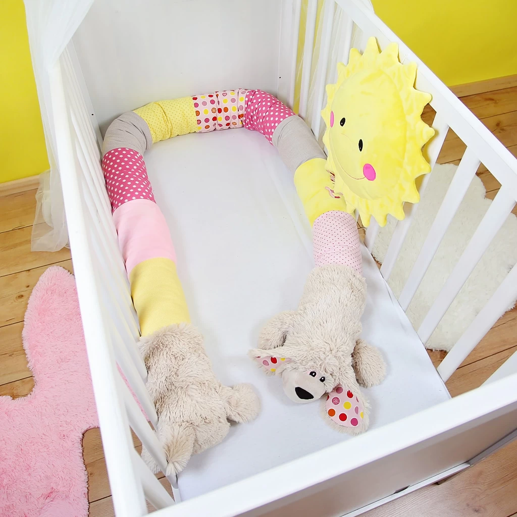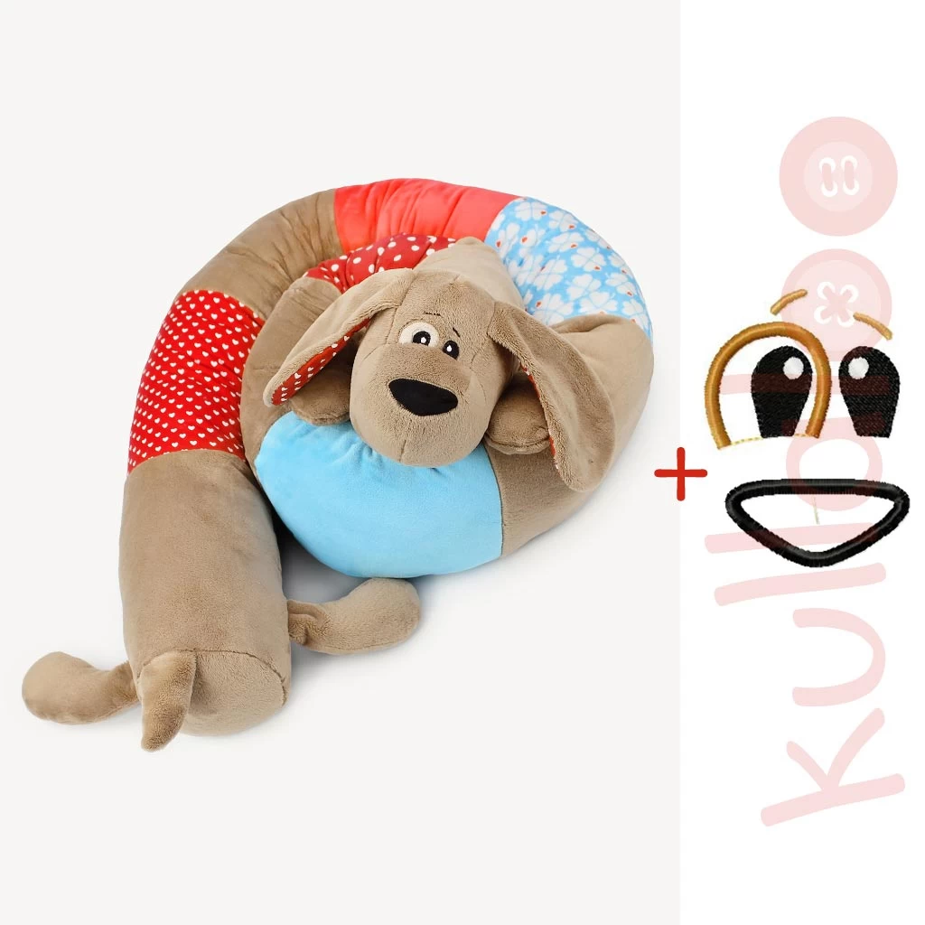 Einen Bettschlangen Hund nähen – Vorlage „WUFFL“ ist ein Schnittmuster zum Bettschlange in Hundeform nähen. So kannst du einen treuen Wachhund für‘s Baby- oder Kinderbett selber machen. WUFFL mit dem lieben Hundeblick lässt sich mit seinen 2 Metern Länge perfekt um das Kopfteil des Bettes legen. So schützt Bettschlange Hund WUFFL vorm Köpfchen-Anstoßen und erschafft eine gemütliche Wohlfühl-Oase. Ideale Voraussetzungen zum Durchschlafen!