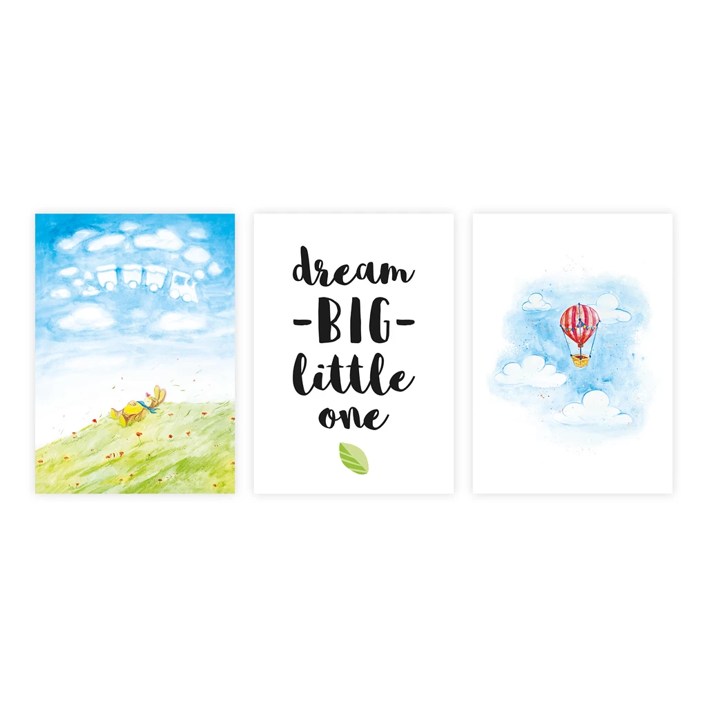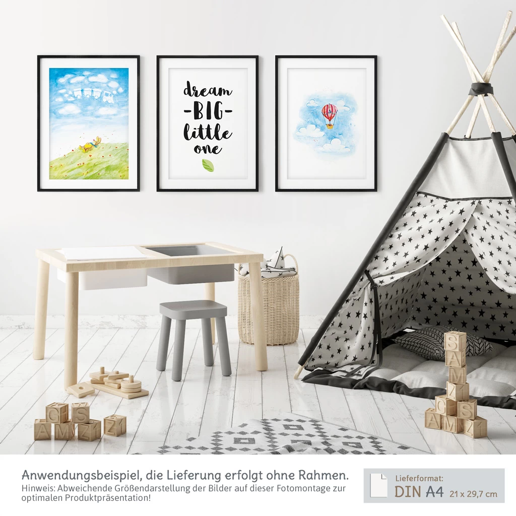 Kombiniert wird das Poster mit dem Bild eines Heißluftballons sowie dem Spruch „Dream big little one“. Damit erhältst du ein wunderschön abgerundetes Set aus drei A4-Kunstdrucken auf hochwertigem 300g-Papier, designed & printed in Germany. Eine tolle Deko fürs Kinder- oder Babyzimmer, sowohl für Jungs als auch für Mädchen!