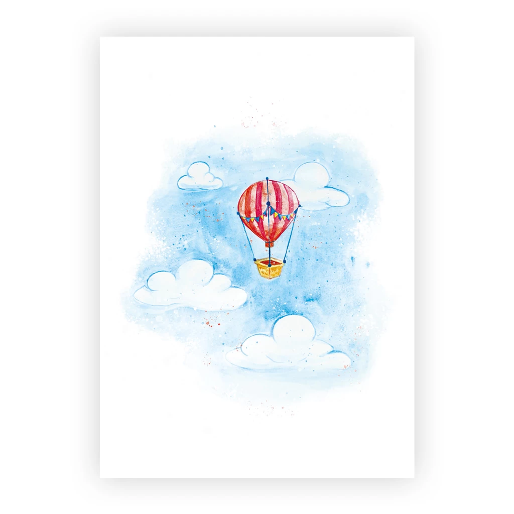 - 1x DIN A4 (21 x 29,7 cm) Kinderzimmer Poster / Kunstdruck Aquarell „Heißluftballon mit Wolken“ ohne Rahmen