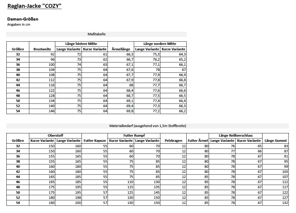 - Bebilderte Nähanleitung (PDF) & Schnittmuster (PDF, pro PDF eine Konfektionsgröße, Nahtzugabe ist bereits enthalten) für gefütterte Raglan-Jacke COZY