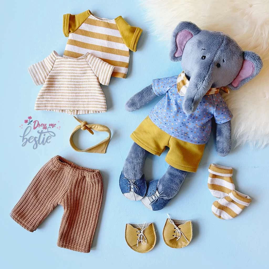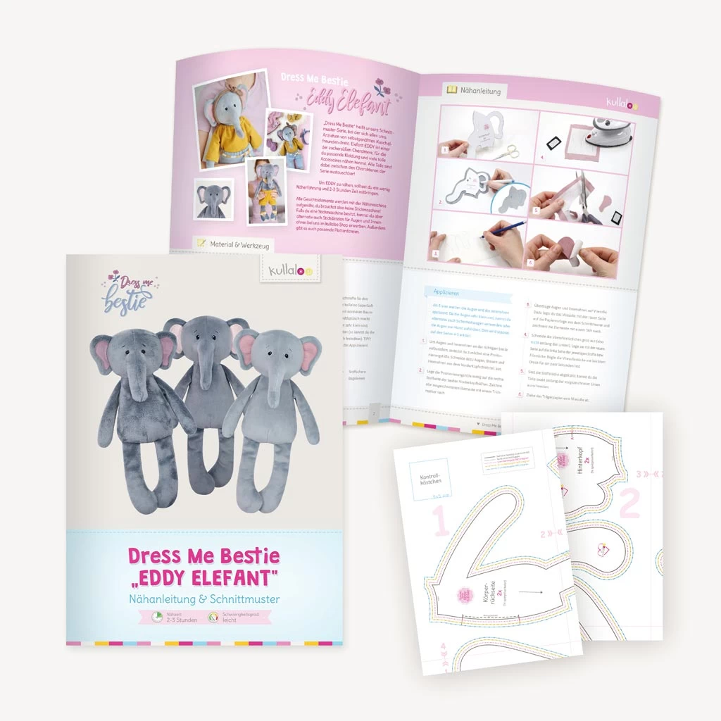 Dress Me Bestie heißt unsere Serie, bei der sich alles ums Anziehen von selbstgenähten Kuschelfreunden dreht! Und EDDY ELEFANT ist einer der Charaktere, für die du passende Kleidung und viele tolle Accessoires nähen kannst. Dieses Produkt enthält dabei die Elefant Nähanleitung sowie die Schnittmuster für die Kleidungsstücke Shirt mit Klett, Allround-Hose, Halstuch, Schnürschuhe und Bündchensocken. Die Kleidungsstücke sind zwischen allen Charakteren der Serie austauschbar, einer wilden Kleidertauschparty steht also nichts im Wege!