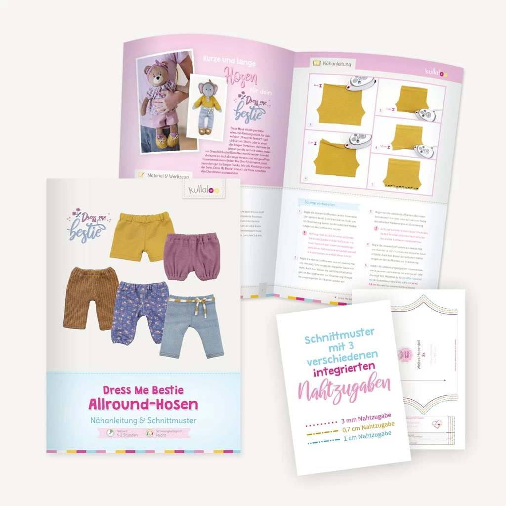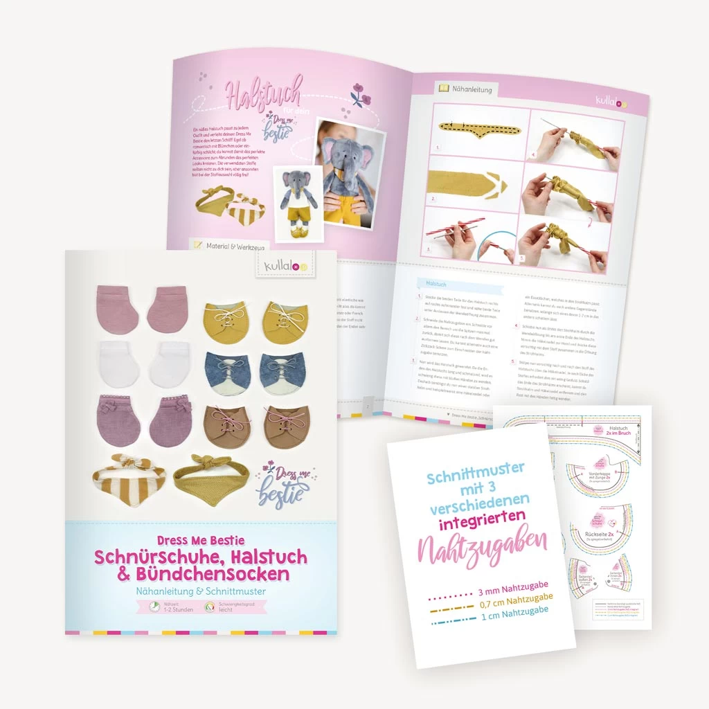 - Jeweils ein PDF mit Anleitung und Schnittmuster for Shirt, Hose und die Accessoires (Halstuch, Schnürschuhe und Bündchensocken)