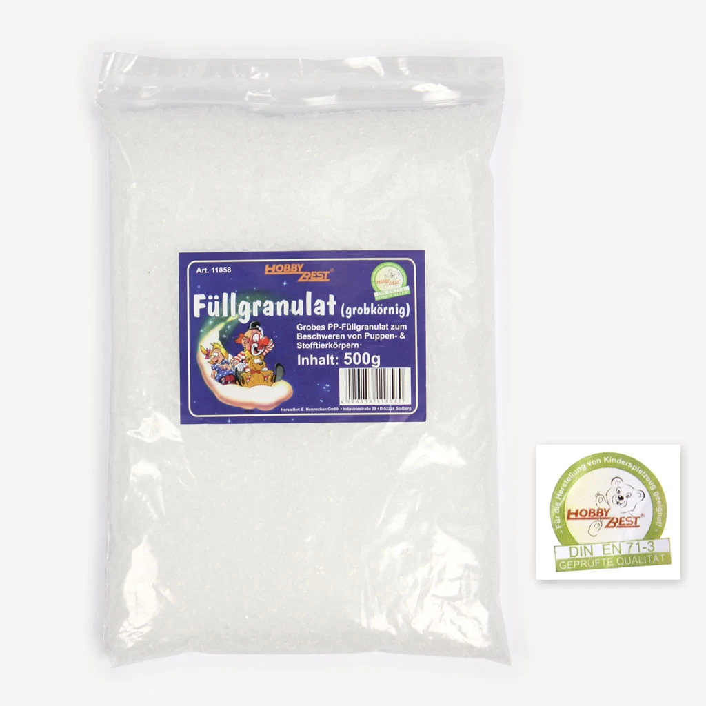 Das grobe PP-Füllgranulat mit ca. 3 mm Körnergröße eignet sich hervorragend zum Beschweren von Puppen- & Kuscheltierkörpern. Durch das Granulat bekommen die Kuscheltiere einen besseren Stand, mehr Gewicht und sie werden insgesamt griffiger. Besonders gern benutzen wir das Granulat zum Einfüllen in Schlenkerarme und -beine, wie beispielsweise bei unserem Hund WUFFL oder dem Reh MOMO. Dadurch schlenkern die Gliedmaßen wirklich, denn sie werden durch das zusätzliche Gewicht nach unten gezogen und stehen nicht starr vom Körper ab. Auch zum Beschweren von Körpern ist das Füllgranulat toll, denn so bekommen die Kuscheltiere ein tolles „Knuddelgewicht“.