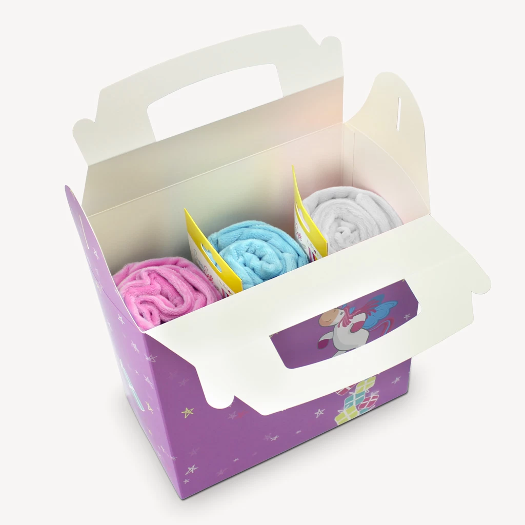 Die dazugehörige wunderschöne Geschenkbox hat einen Tragegriff und erhält durch die feste, beschichtete Pappe mit Seidenglanz-Optik einen tollen hochwertigen Look. Sie lässt sich oben am Griff öffnen, bedruckt ist sie mit Sternen, einem zuckersüßen Einhorn auf der Vorderseite und dem Schriftzug „Für dich“. Die Grundfarbe der Geschenkverpackung ist lila. Also nicht nur das perfekte Geschenk für Nähfans, sondern auch für alle, die dem Einhorn-Wahn verfallen sind 🙂