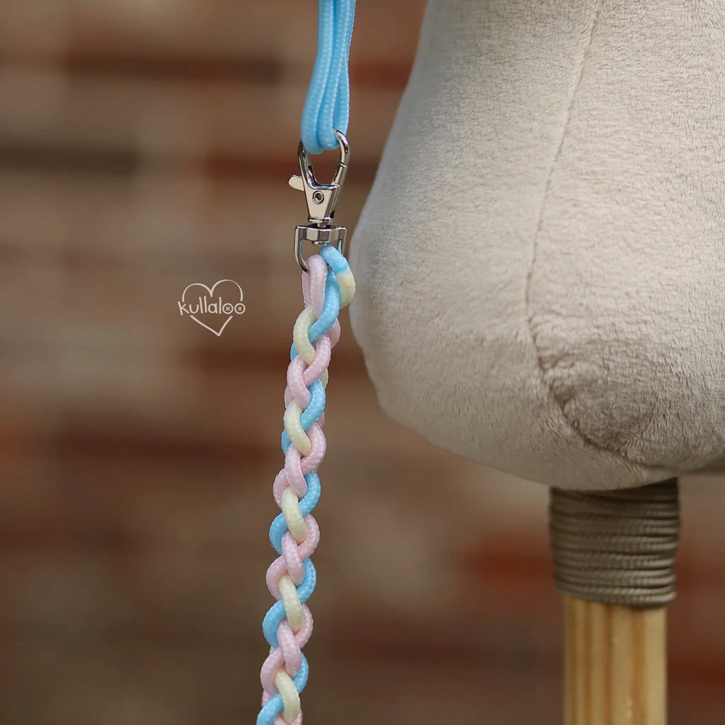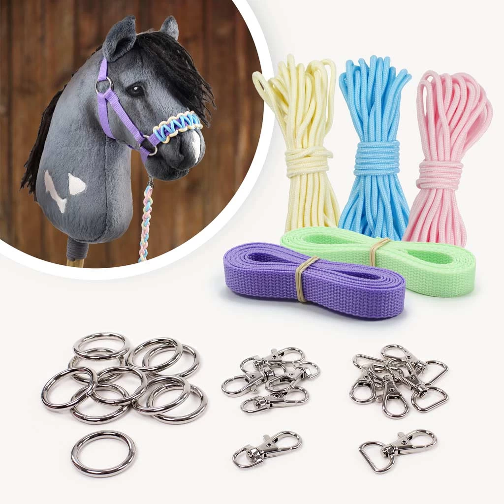 Mit diesem pastellfarbenen Materialset bekommst du alle Zutaten, die du zum Hobby Horse Halfter basteln benötigst (Stallhalfter, Knotenhalfter und Führstricke)! Das Gurtband mit 1,5 cm Breite und die Seile mit 4 mm Durchmesser sind dabei farblich toll aufeinander abgestimmt. Du kannst die Nasenriemen der Stallhalfter mit den Seilen umflechten und schöne Führstricke oder Zügel damit anfertigen.