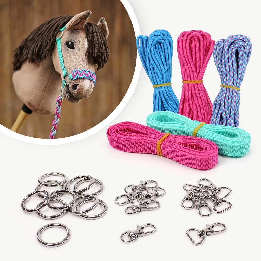 Du kannst mit diesem Hobby Horse Halfter Material Set zum Beispiel zwei unterschiedlich farbige Stallhalfter aus dem Gurtband fertigen (pro Halfter benötigt: ca. 1,5 m Gurtband, 5 O-Ringe, 1 Karabiner mit geradem Auge). Aus dem restlichen Gurtband kannst du zwei kurze Führstricke mit geraden Karabinern machen. Zum Umflechten eines Halfters benötigst du 2 Farben des PP-Seils, und zwar ca. 0,7 m pro Farbe.