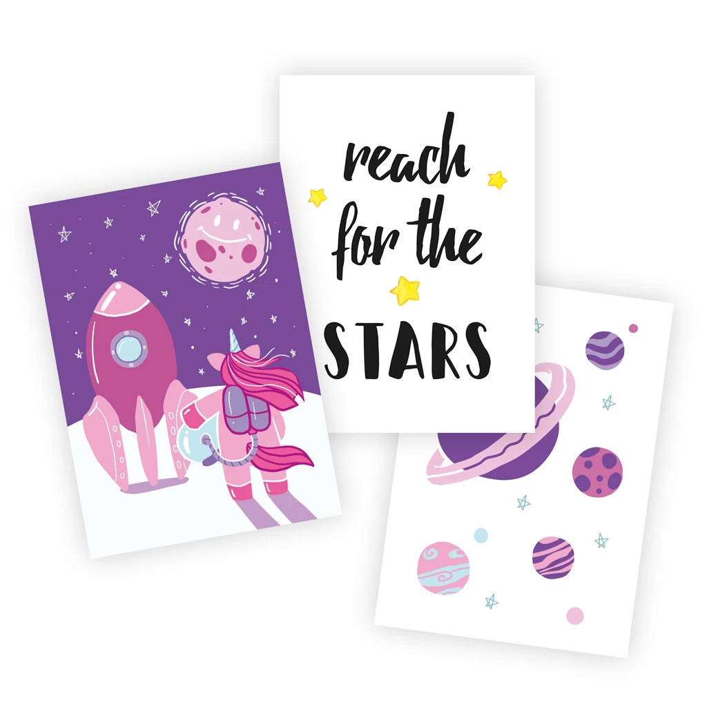 Die Motive wurden von uns mit viel Liebe zum Detail illustriert. Das Posterset besteht dabei aus zwei Illustrationen mit Einhorn und Planeten, und passend dazu gibt es den Spruch „Reach for the stars“. Damit erhältst du ein wunderschön abgerundetes Set aus drei A4-Kunstdrucken auf hochwertigem 300g-Papier, designed & printed in Germany. Eine tolle Deko fürs Kinder- oder Babyzimmer, für Einhornfans und kleine Astronauten!