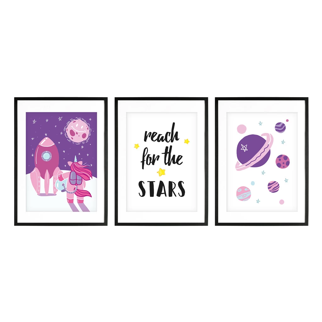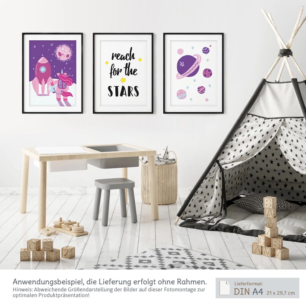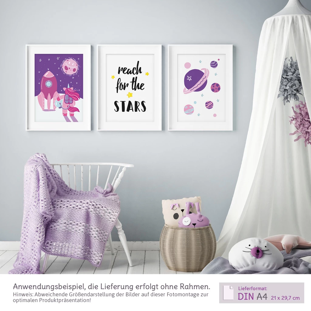 Lieferumfang der Kinderzimmer Bilder „Einhorn im Weltraum“ als 3er-Set:
