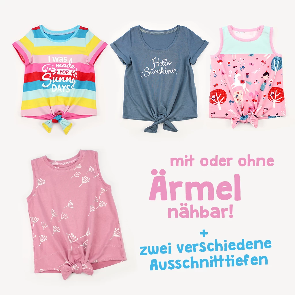 - Kann mit Ärmel als T-Shirt oder ohne Ärmel als Top genäht werden