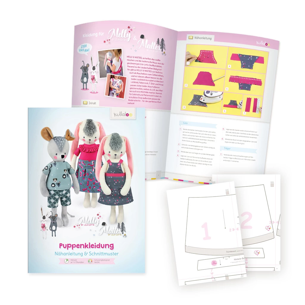 Die beiden Kuschelfreunde sind 50 cm groß, haben lustige Schlenkerbeinchen und erobern jedes Herz im Nu! Bei den Kleidungsschnitten sind vier verschiedene Schnitte für Latzkleid, Faltenrock, T-Shirt und kurzer Hose dabei, die sowohl MELLY als auch MATTES passen. Jeder einzelne Schnitt ist fix genäht und so kannst du im Nu eine ganze Garderobe für beiden Kuschelfreunde herstellen.