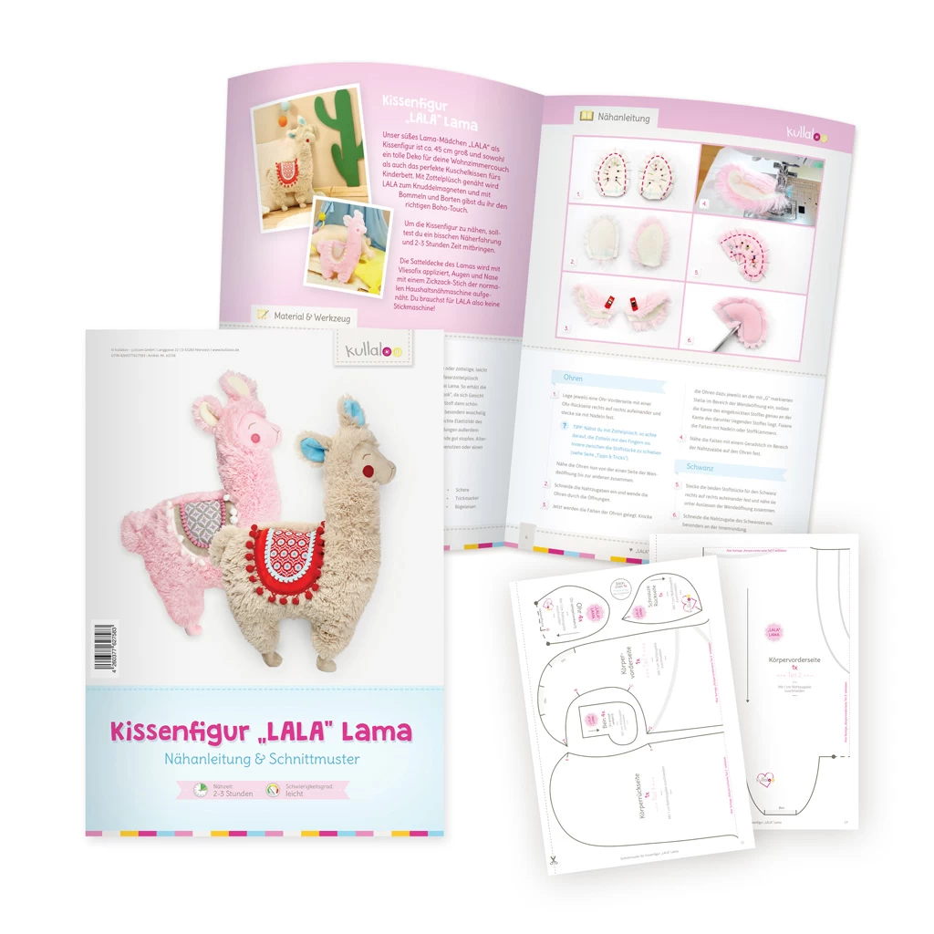 - 1 Papierschnittmuster Kissenfigur „LALA“ Lama, als farbige Broschüre und Schnittmuster in Originalgröße zum Ausschneiden