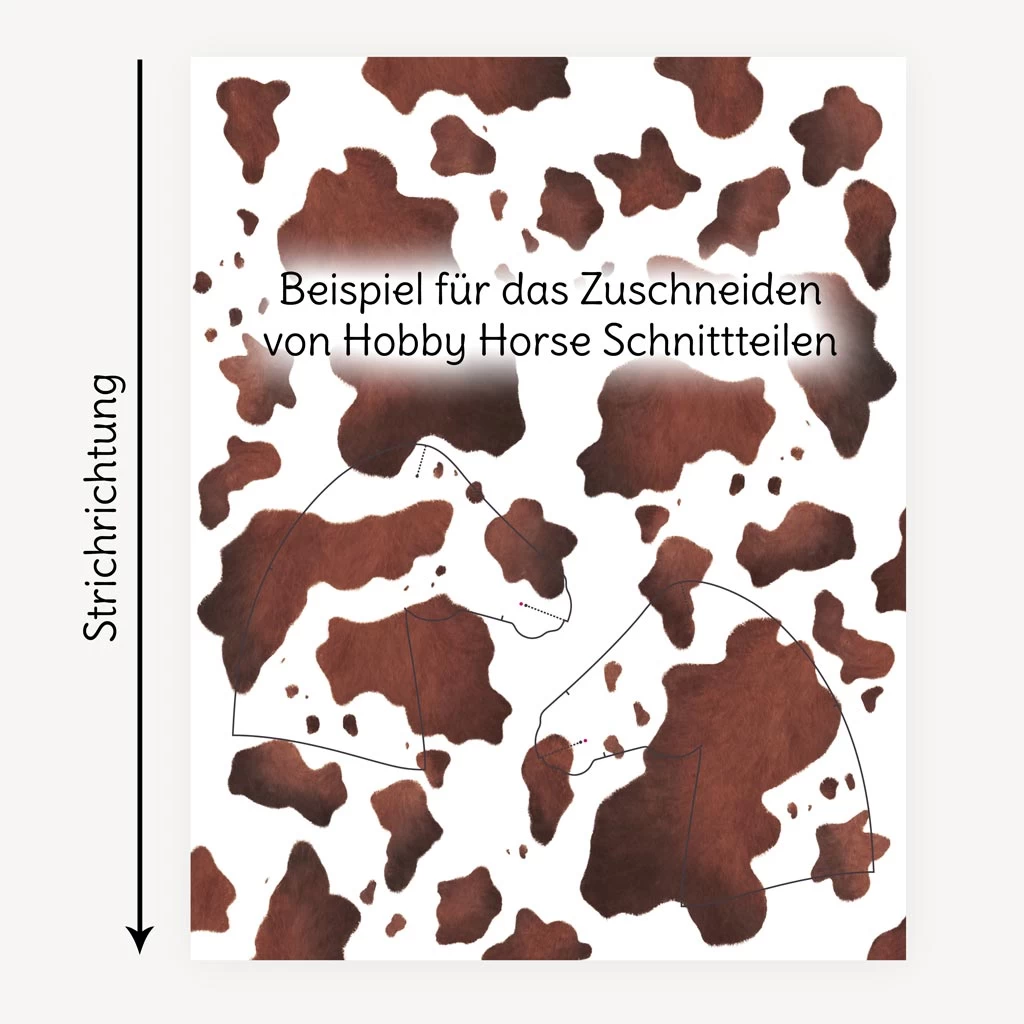 Hobby Horse Stoff: Unser Hobby Horse Stoff mit geflecktem Muster ist der ideale Velboa Stoff zum Nähen eines dunklen / dunkelbraunen Hobby Horse Schecken – und zwar ohne die typischen Flecken selbst mit Stoffmalfarbe aufzumalen! Über die Fläche des 100 x 75 cm großen Stoffstücks befinden sich Flecken unterschiedlicher Größe, welche die Scheckung, also die Fellflecken auf einem Pinto imitieren. Die Flecken haben einen natürlichen Farbverlauf, wie er bei braunen Pferden zu finden ist. Damit kannst du die Schnittteile für dein Hobby Horse individuell platzieren und erreichst mit einem Panel unendlich viele Möglichkeiten!