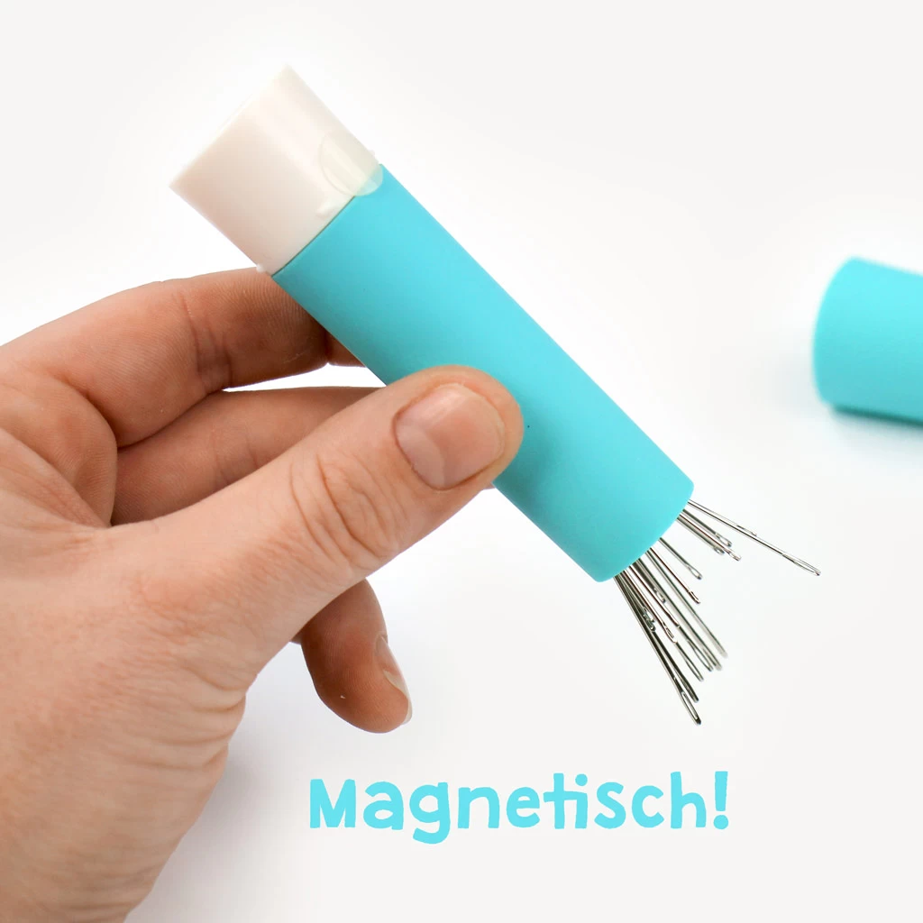 Die Nadeln werden durch einen Magneten im Inneren des Nadel-Twisters gehalten. So können sie nicht herausfallen. Durch Drehen am unteren Ende des Twisters lassen sich die Nadeln bequem rein- und rausdrehen. Beim Herausdrehen der Nadeln fächern sich diese übersichtlich auf und lassen sich so bequem entnehmen. Auf diese Weise dient der Nadel-Twister als mobiles Aufbewahrungsdepot für alle Nadeln aus Stahl.