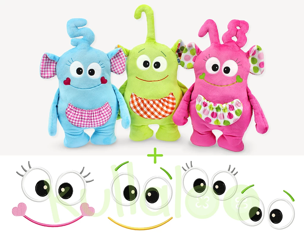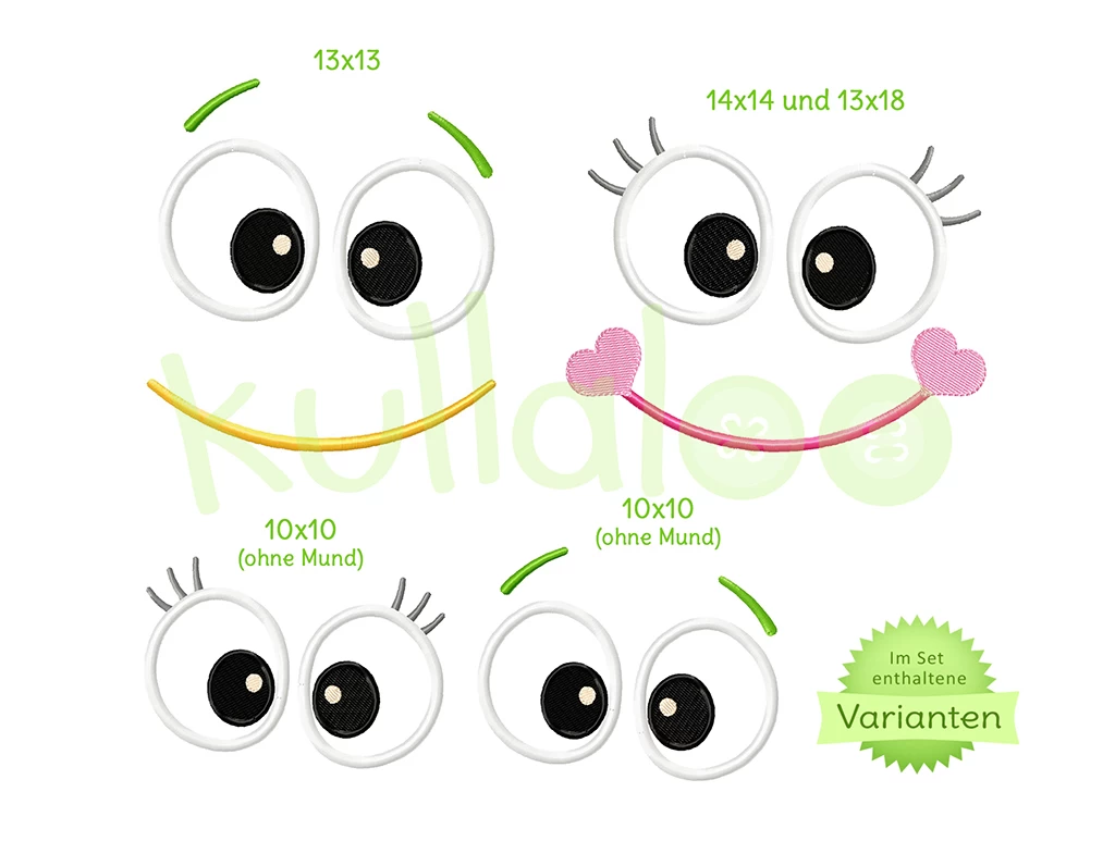 - 1 Stickdatei für Augen Jungsversion stickbar in 10×10 (ohne Mund): 9,9 x 7,66 cm