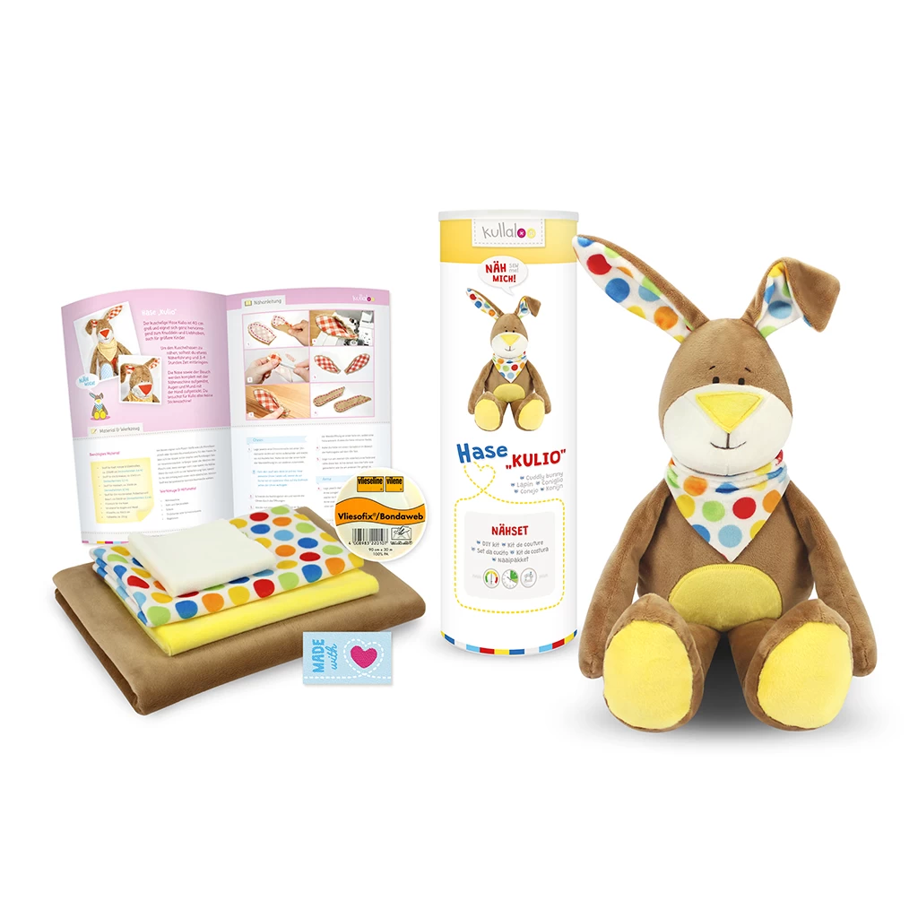Das Nähset Hase „KULIO“ enthält kuschelweiche Microfaser Plüsch Stoffe zum selber nähen unseres Kuschelhasen mit der Nähmaschine, verpackt in einer stylischen Dose. Im Set enthalten ist außerdem 1 Textil-Label zum Einnähen mit dem Schriftzug „Made with Love“.