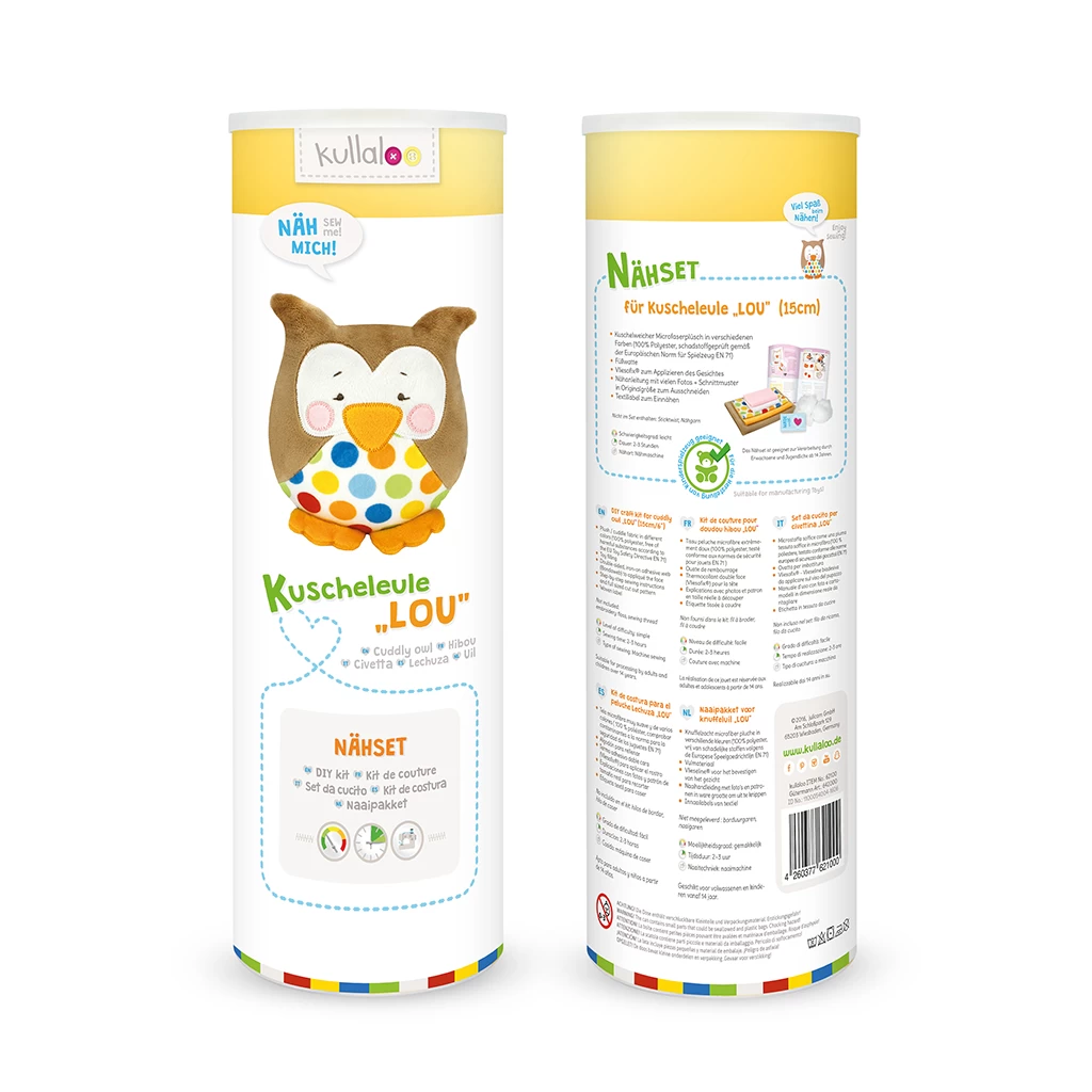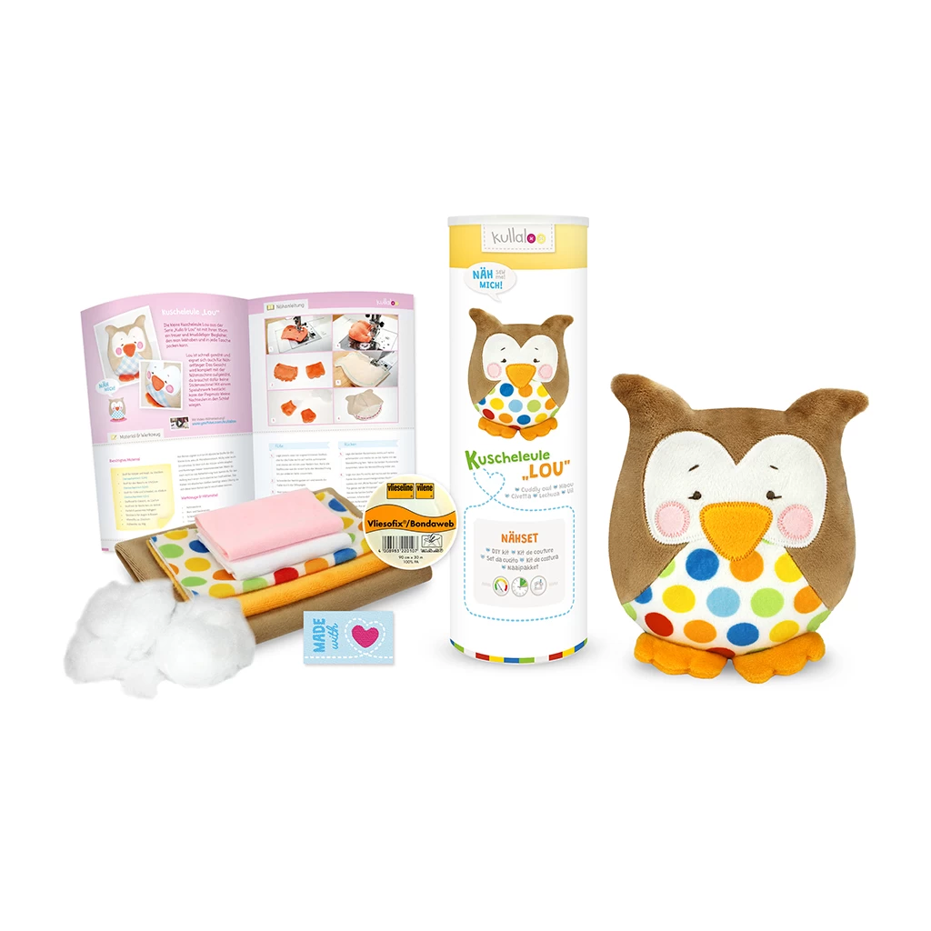 Das Materialset / Nähset Kuscheltier Eule „LOU“ in braun / gepunktet enthält kuschelweiche Microfaser Plüsch Stoffe zum selber nähen unserer kleinen Eule „LOU“ mit der Nähmaschine, verpackt in einer stylischen Dose. Außerdem ist im Set Füllwatte und ein Textil-Label zum Einnähen enthalten, mit dem du deinem Kuscheltier eine ganz persönliche Note verleihen kannst und es erhält zudem einen besonderen Erinnerungswert.