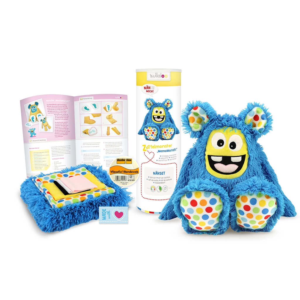 Das Materialset / Nähset Zottelmonster in blau enthält kuschelweiche Microfaser Plüsch Stoffe zum selber nähen unseres Kuschelmonsters „MemoMonsti“ mit der Nähmaschine, verpackt in einer stylischen Dose. Im Set enthalten ist außerdem 1 Textil-Label zum Einnähen mit dem Schriftzug „Made with Love“.