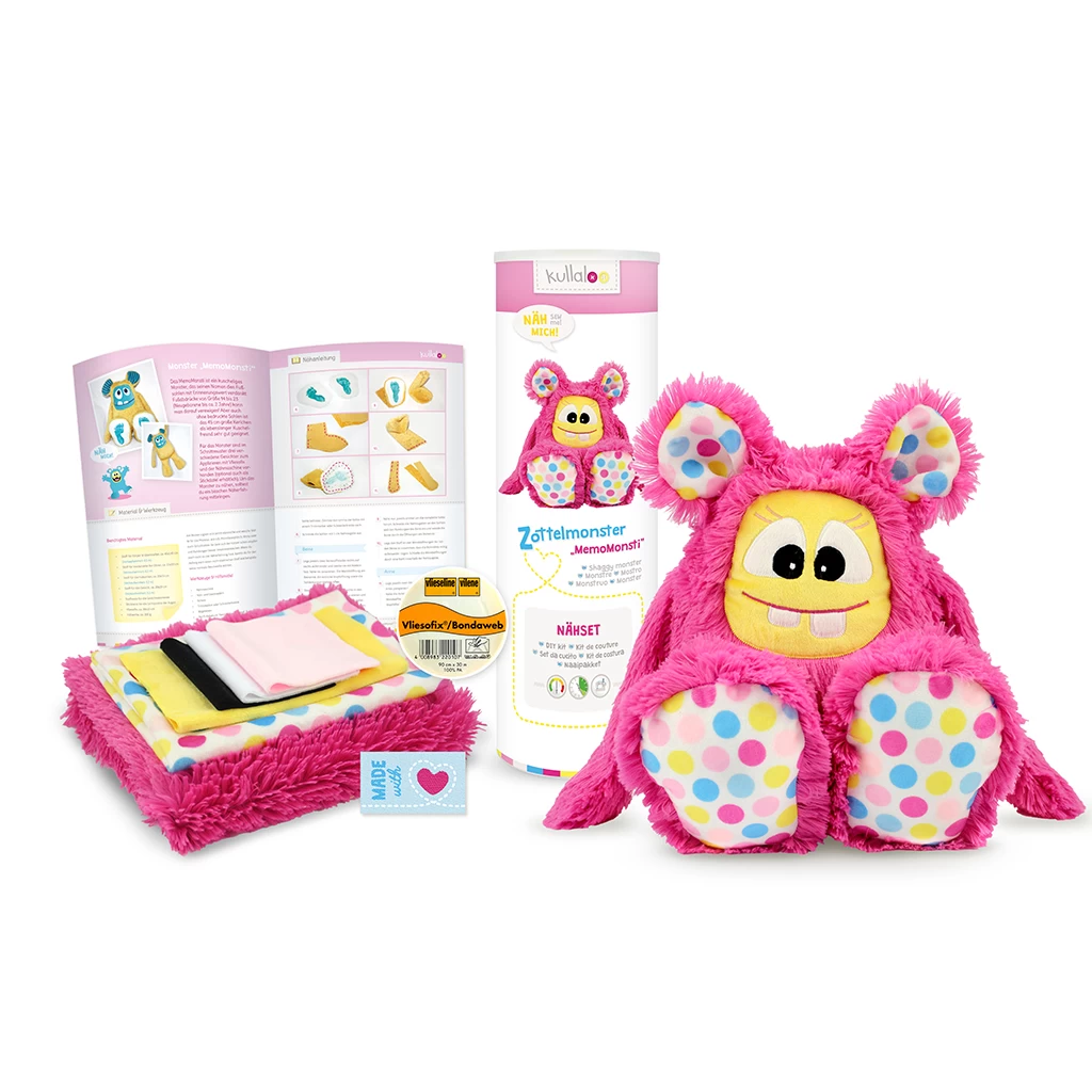 Das Materialset / Nähset Zottelmonster in pink enthält kuschelweiche Microfaser Plüsch Stoffe zum selber nähen unseres Kuschelmonsters „MemoMonsti“ mit der Nähmaschine, verpackt in einer stylischen Dose. Im Set ist außerdem ein Textil-Label zum Einnähen enthalten. Damit kannst du deinem Kuscheltier eine ganz persönliche Note verleihen und es erhält zudem einen besonderen Erinnerungswert.