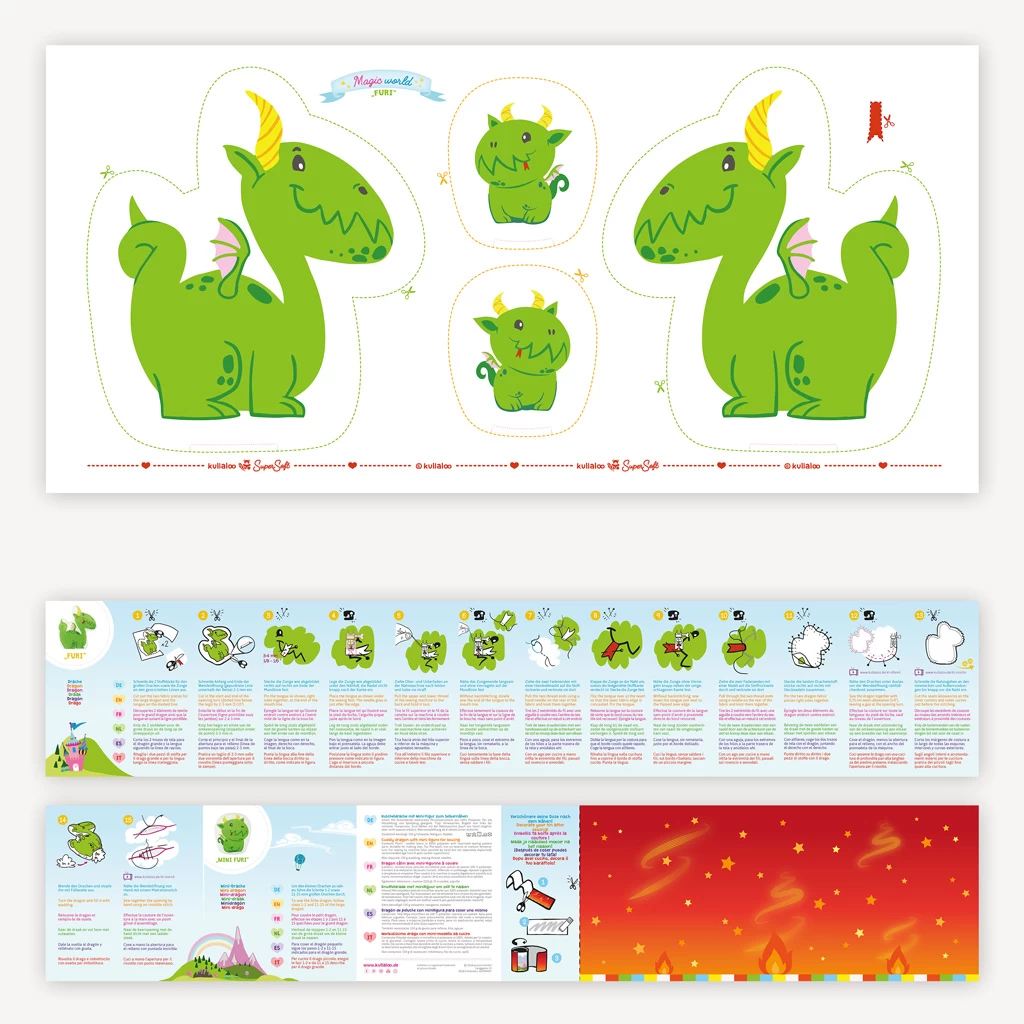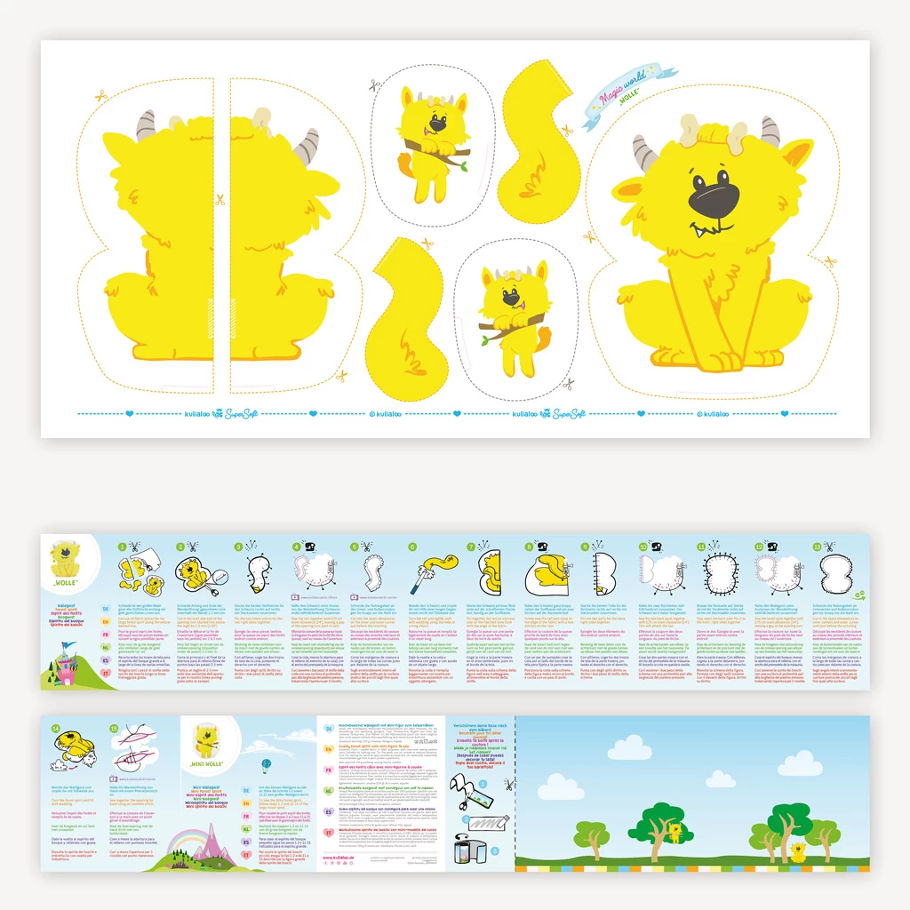 Jedes der fünf Sets enthält ein Plüschstoffstück mit den Vordrucken für die einzelnen Schnittteile (Microfaserplüsch / Minky, 100% Poylester, 1,5 mm Florlänge, schadstoffgeprüft gemäß der europäischen Norm für Spielzeug), für jeweils für eine Kissenfigur von ca. 25 cm und eine Minifigur von ca. 10 cm. Außerdem enthält jedes Set eine detaillierte, illustrierte Nähanleitung.