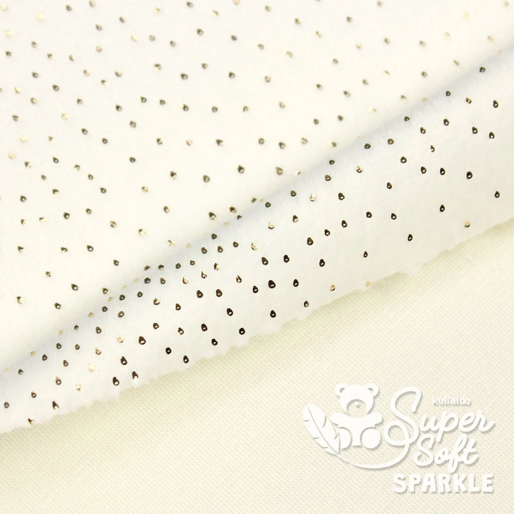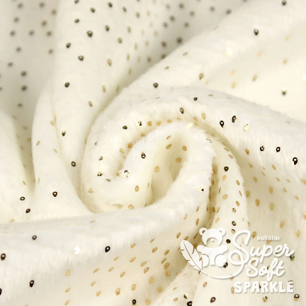 Lange haben wir danach gesucht, nun haben wir ihn endlich gefunden: Also Vorhang auf für unseren neuen traumhaften Glitzerplüsch, den kullaloo SuperSoft SPARKLE! SPARKLE ist genauso unglaublich weich, wie du es von unseren anderen kullaloo Plüschstoffen kennst. Aber er ist mit vielen kleinen goldfarbenen Glitzerpünktchen bedruckt, sodass er jedes selbstgenähte Kuscheltier in ein ganz besonders magisches Wesen verwandeln kann. Der Plüsch Stoff Glitzer wollweiß passt natürlich farblich in die kullaloo Plüschfamilie und ist damit wunderbar mit unseren anderen Plüschstoffen kombinierbar!