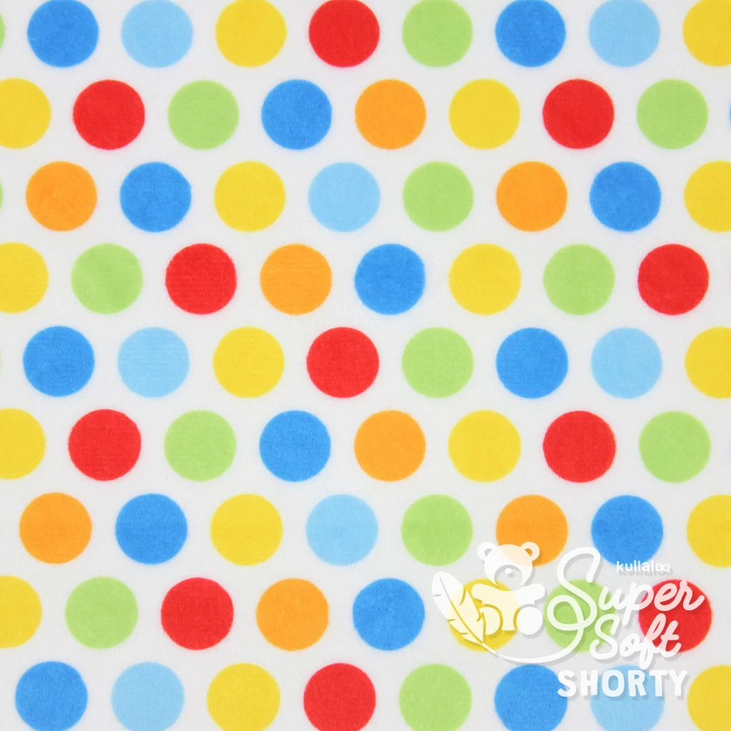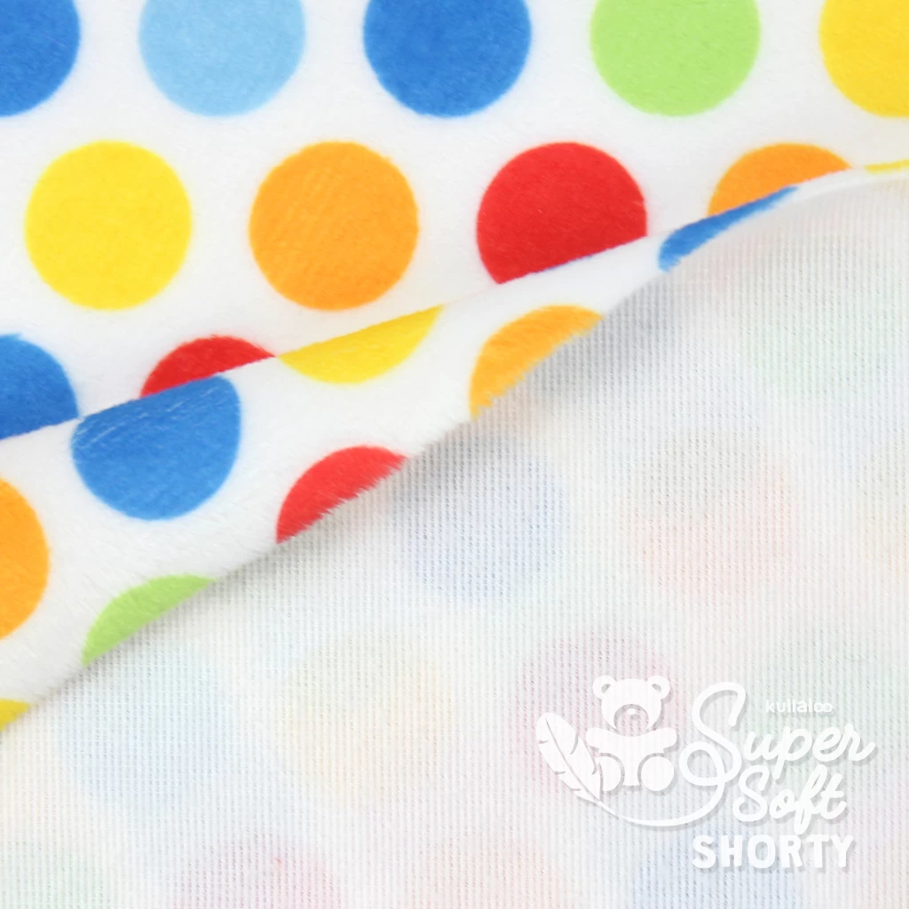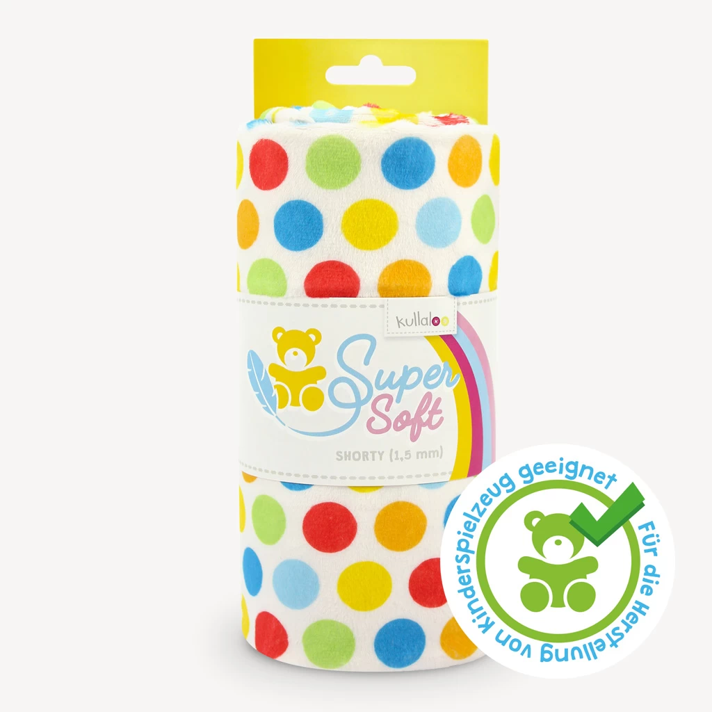 Unser SuperSoft SHORTY Plüschstoff gepunktet „Hula Dots“ multi ist ein leicht dehnbarer, qualitativ hochwertiger Microfaser-Plüsch / Minky aus dem Hause kullaloo. Egal, ob du den Plüsch zum Kindersachen nähen benötigst oder für Nähprojekte im Bereich Deko- und Wohntextilien, unser Kurzhaarplüsch SHORTY ist das ideale Material! Du kannst mit den vielen fröhlichen und leuchtenden Farben ganz bezaubernde Kuscheltiere nähen, aber auch wundervolle Babydecken, Knistertücher oder andere Baby-Accessoires. Unser fröhliches Punkte-Design „Hula Dots“ ist dabei ein toller Kombistoff für viele unserer unifarbenen Plüschstoffe, egal ob mit Kurzhaar- oder Zottelplüschs!