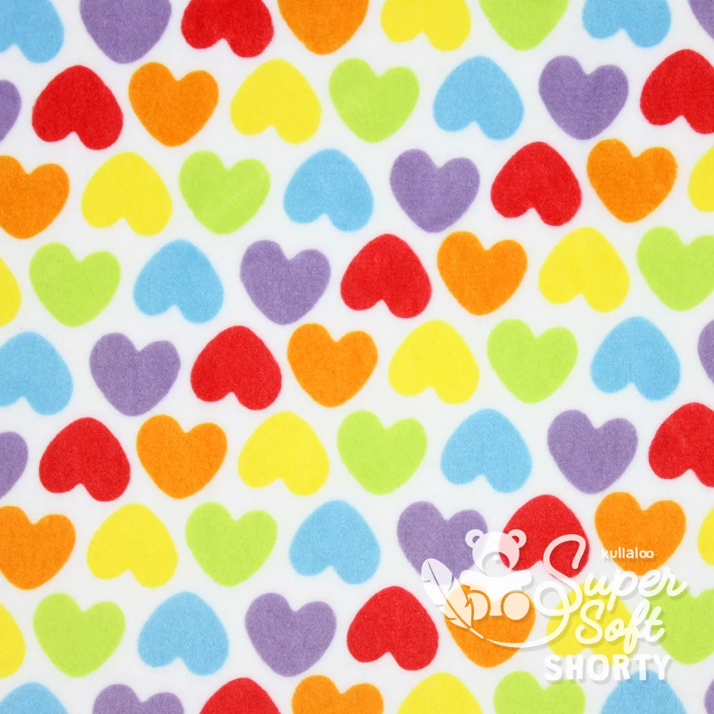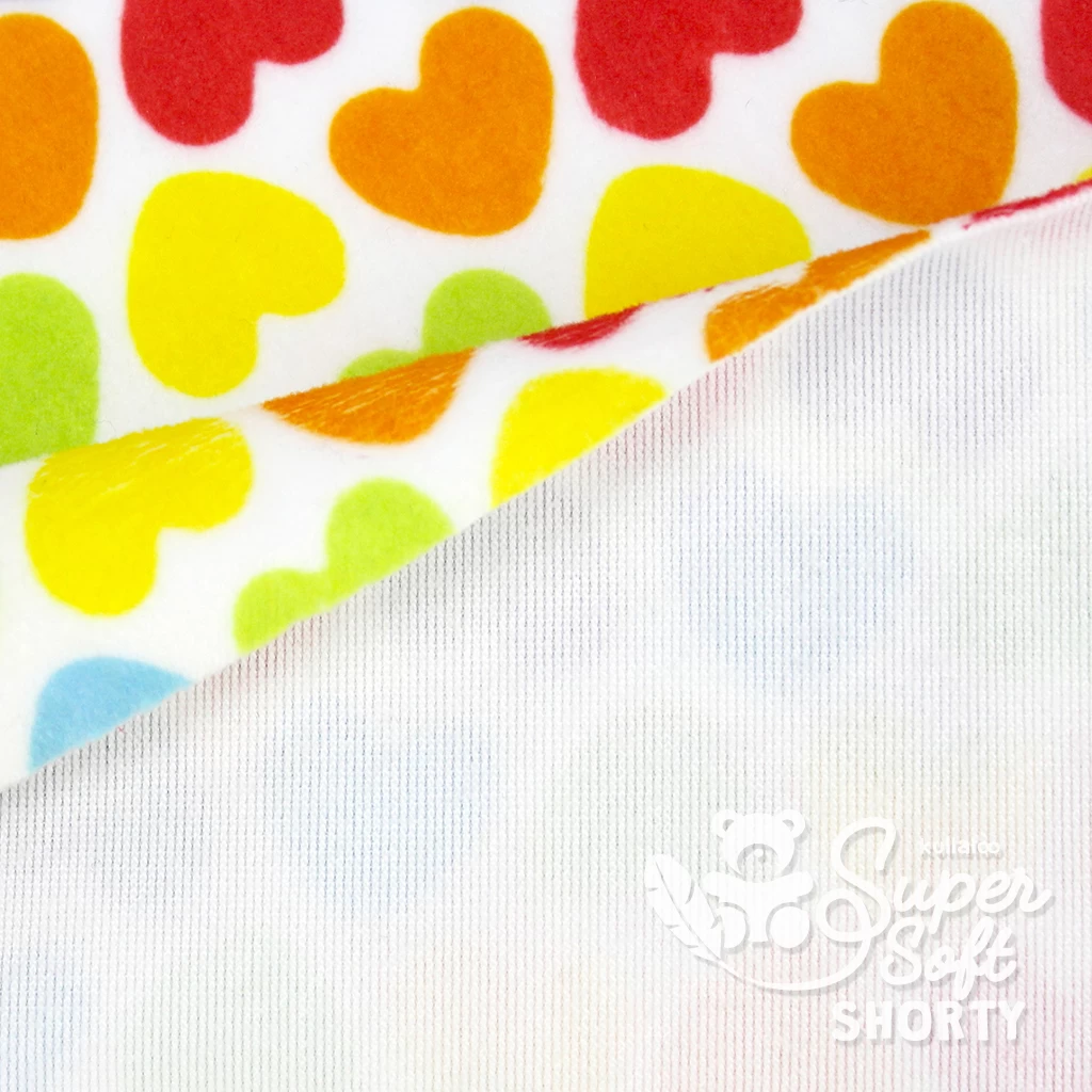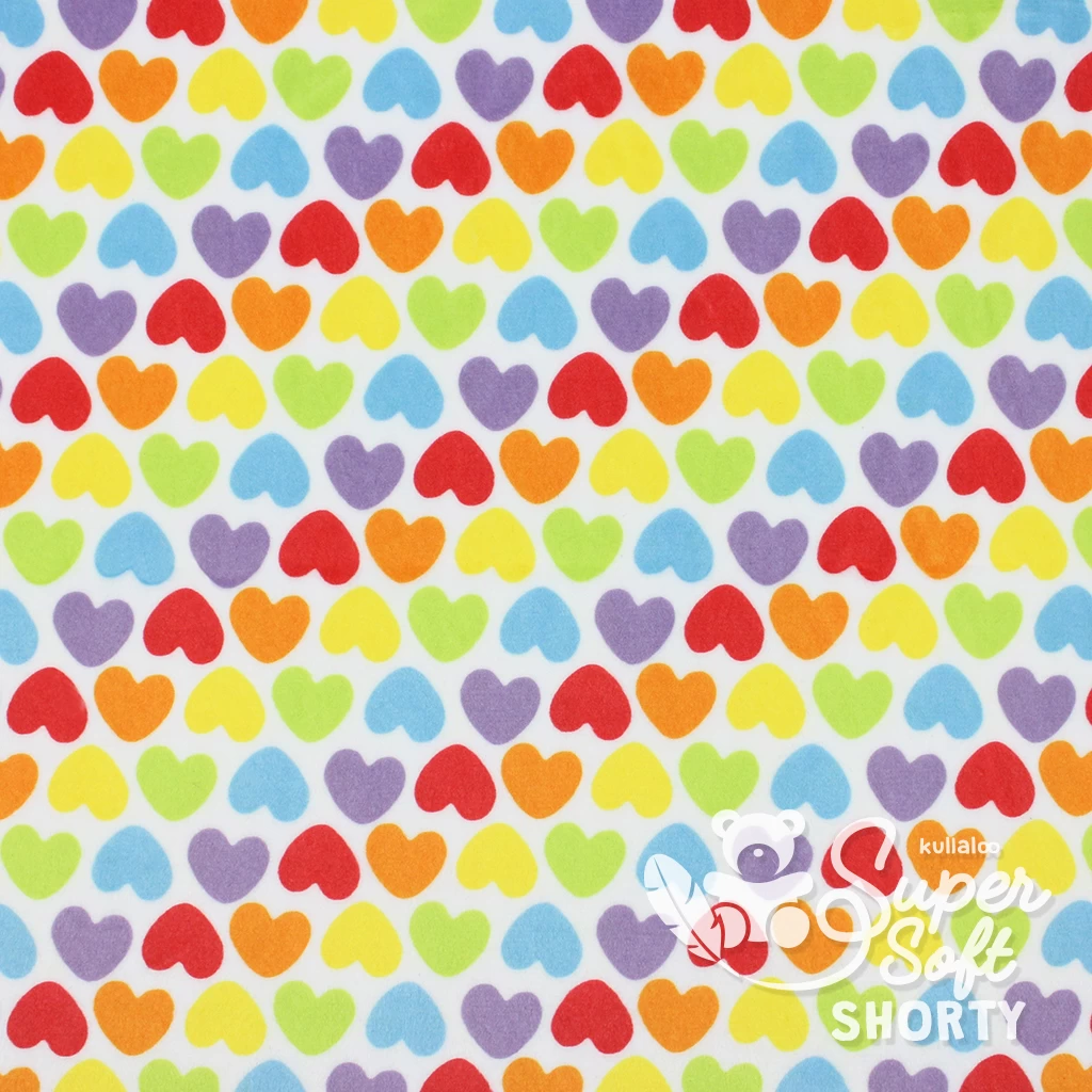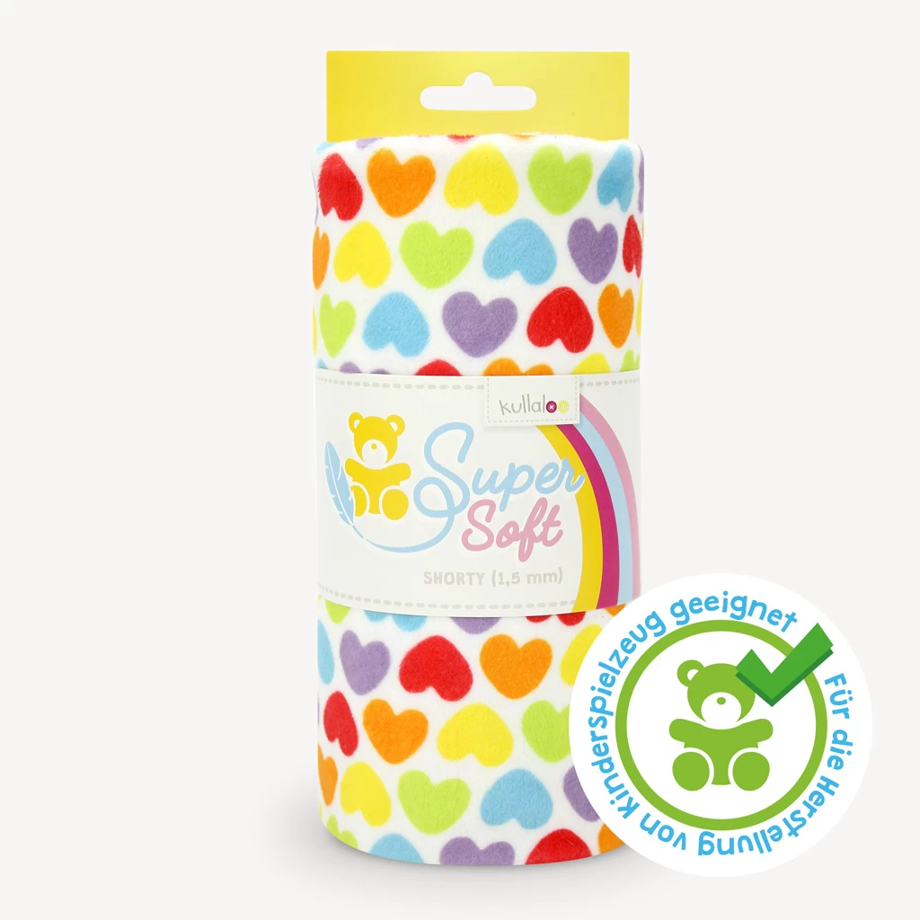 Unser SuperSoft SHORTY Plüschstoff Muster „Rainbow Love HEARTS“ ist ein leicht dehnbarer, qualitativ hochwertiger Microfaser-Plüsch / Minky aus dem Hause kullaloo. Egal, ob du den Plüsch zum Kindersachen nähen benötigst oder für Nähprojekte im Bereich Deko- und Wohntextilien, unser Kurzhaarplüsch SHORTY ist das ideale Material! Du kannst mit den vielen fröhlichen und leuchtenden Farben ganz bezaubernde Kuscheltiere nähen, aber auch wundervolle Babydecken, Knistertücher oder andere Baby-Accessoires. Unser fröhliches Herzen-Design hat die Farben des Regenbogens (gelb, orange, rot, lavendel, türkis und grün) und ist damit ein toller Kombistoff für viele unserer unifarbenen Plüschstoffe, egal ob mit Kurzhaar- oder Zottelplüschs!