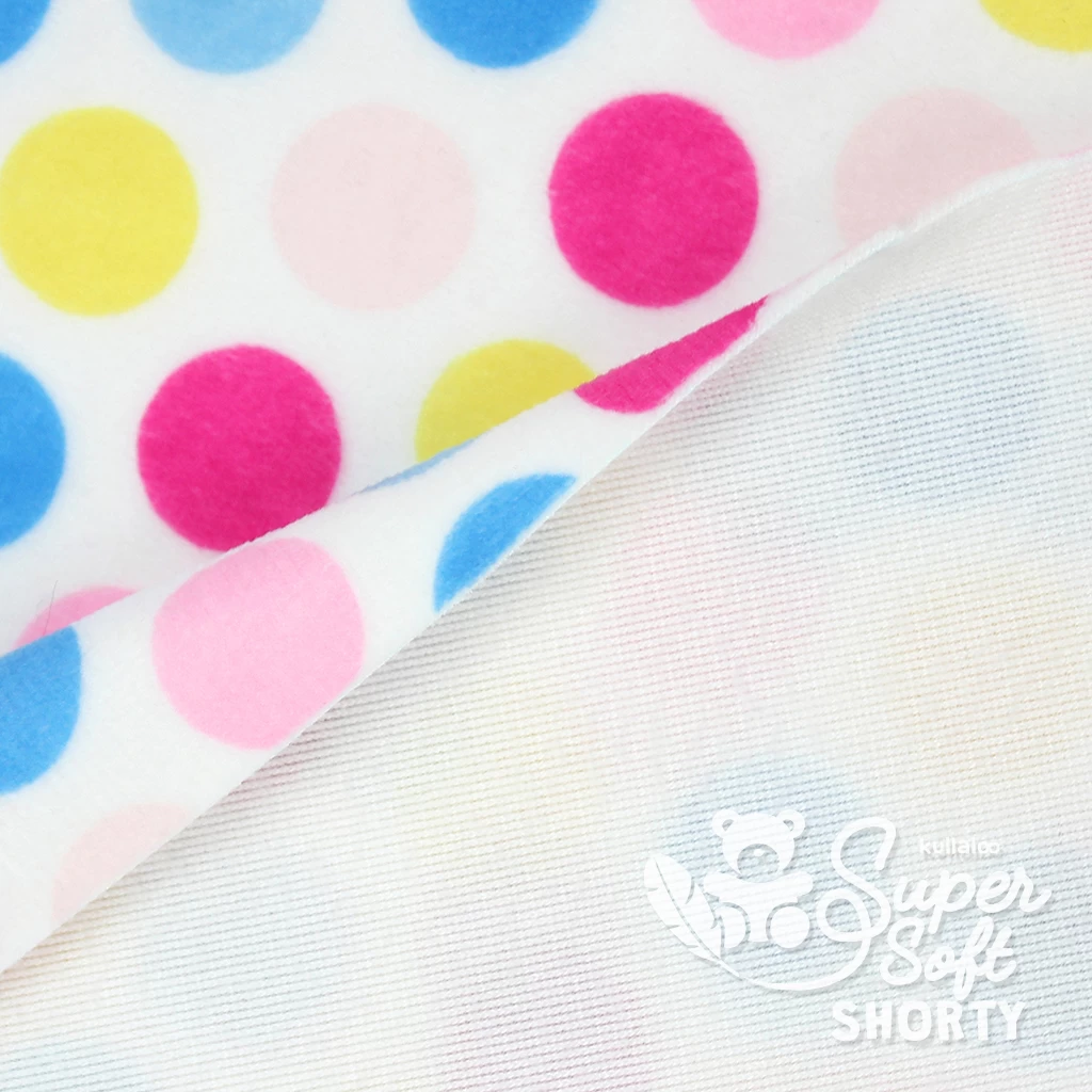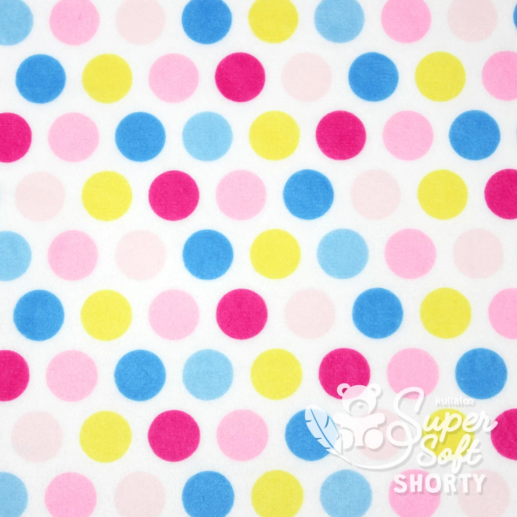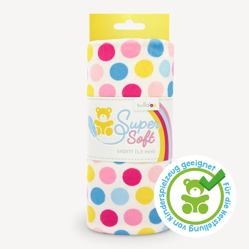 Unser SuperSoft SHORTY Plüschstoff Punkte „Hula Dots“ in pink/blau ist ein leicht dehnbarer, qualitativ hochwertiger Microfaser-Plüsch / Minky aus dem Hause kullaloo. Egal, ob du den Plüsch zum Kindersachen nähen benötigst oder für Nähprojekte im Bereich Deko- und Wohntextilien, unser Kurzhaarplüsch SHORTY ist das ideale Material! Du kannst mit den vielen fröhlichen und leuchtenden Farben ganz bezaubernde Kuscheltiere nähen, aber auch wundervolle Babydecken, Knistertücher oder andere Baby-Accessoires. Unser fröhliches Punkte-Design „Hula Dots“ ist dabei ein toller Kombistoff für viele unserer unifarbenen Plüschstoffe, egal ob mit Kurzhaar- oder Zottelplüschs!