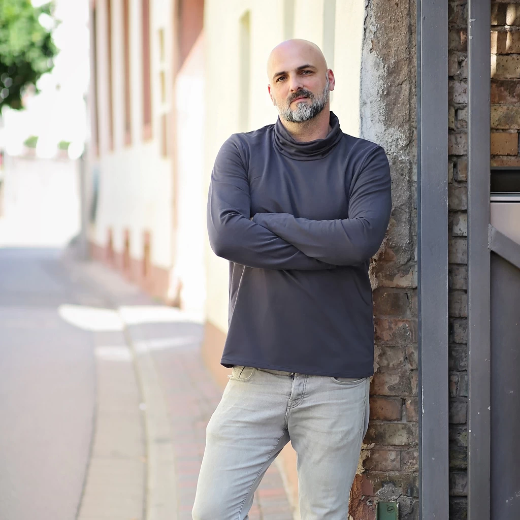 Rollkragenpullover „RENATE“ ist in der Herrenversion leger geschnitten. Der Schnitt eignet sich übrigens klasse zum Aufpeppen mit Plottermotiven oder sonstigen Bügelbildern oder zum Besticken.