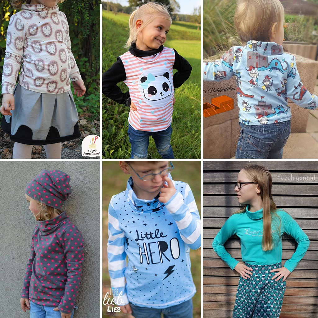 Die Damenversion des Rollkragenpullovers ist besonders in den kleineren Größen tailliert geschnitten. In den Kindergrößen ist der Rollkragenpullover kindgerecht leger geschnitten und macht so jeden Spaß mit. Der Schnitt eignet sich übrigens klasse zum Aufpeppen mit Plottermotiven oder sonstigen Bügelbildern oder zum Besticken.