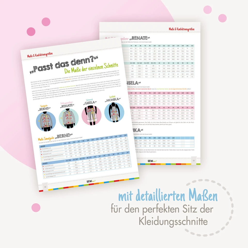 In dieser Ausgabe der SEWwhat? findest du einen kunterbunten Schnittmustermix aus Kleidung, Accessoires, Deko & Spielzeug, sowohl für Kinder als auch für Erwachsene. Die enthaltenen Kleidungsgrößen gehen dabei für Kinder von 74 bis 152 und bei den Damen von 32 bis 54. Die Kindergrößen 158-176 entsprechen den Damengrößen 32-38.
