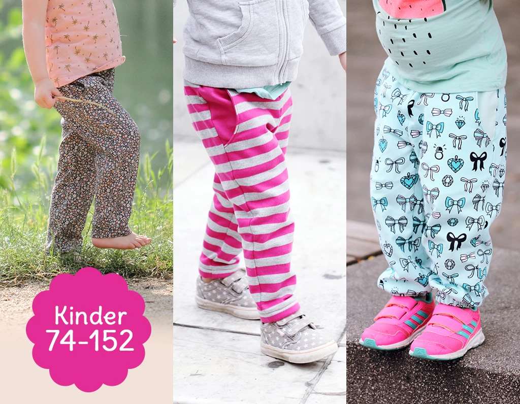 Dieses Produkt enthält die Kindergrößen von 74-152. Wir bieten zusätzlich ein weiteres Produkt für die Damengrößen 32-54 an bzw. auch ein Doppel-eBook mit allen Schnittgrößen für Kinder und Damen. Für die Damengrößen gibt es neben dem normalen schmalen Bund noch einen Wasserfall-Bund, der seitlich gerafft wird und über den Hosenstoff fällt. Die Bein-Enden sind mit einem doppelten Saum versehen.