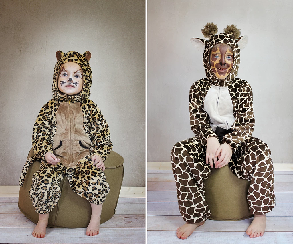 Der Basis-Overall hat einen lockeren Schnitt mit eingenähten Gummizügen an Ärmeln und Beinen. Öffnen lässt sich das Kostüm durch einen mittigen Reißverschluss auf der Vorderseite. Den Tiercharakter bekommt der Overall durch den verwendeten Stoff, aber auch durch die im Schnittmuster integrierten Vorlagen für Ohren und Schwänze.