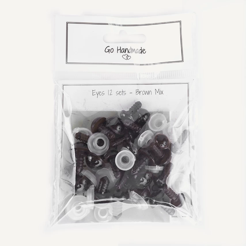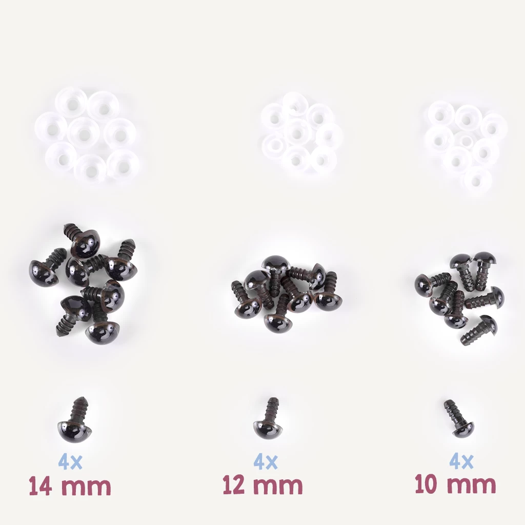 Eine Packung enthält 12 Sets von je 4 Sicherheitsaugen mit dazugehörigen Verschlüssen. Der Durchmesser der Sicherheitsaugen beträgt zwischen 10 und 14 mm. Alternativ haben wir auch ein Set mit nur 6 mm schwarzen Augen für dich im Shop oder einen Mix mit schwarzen Augen!