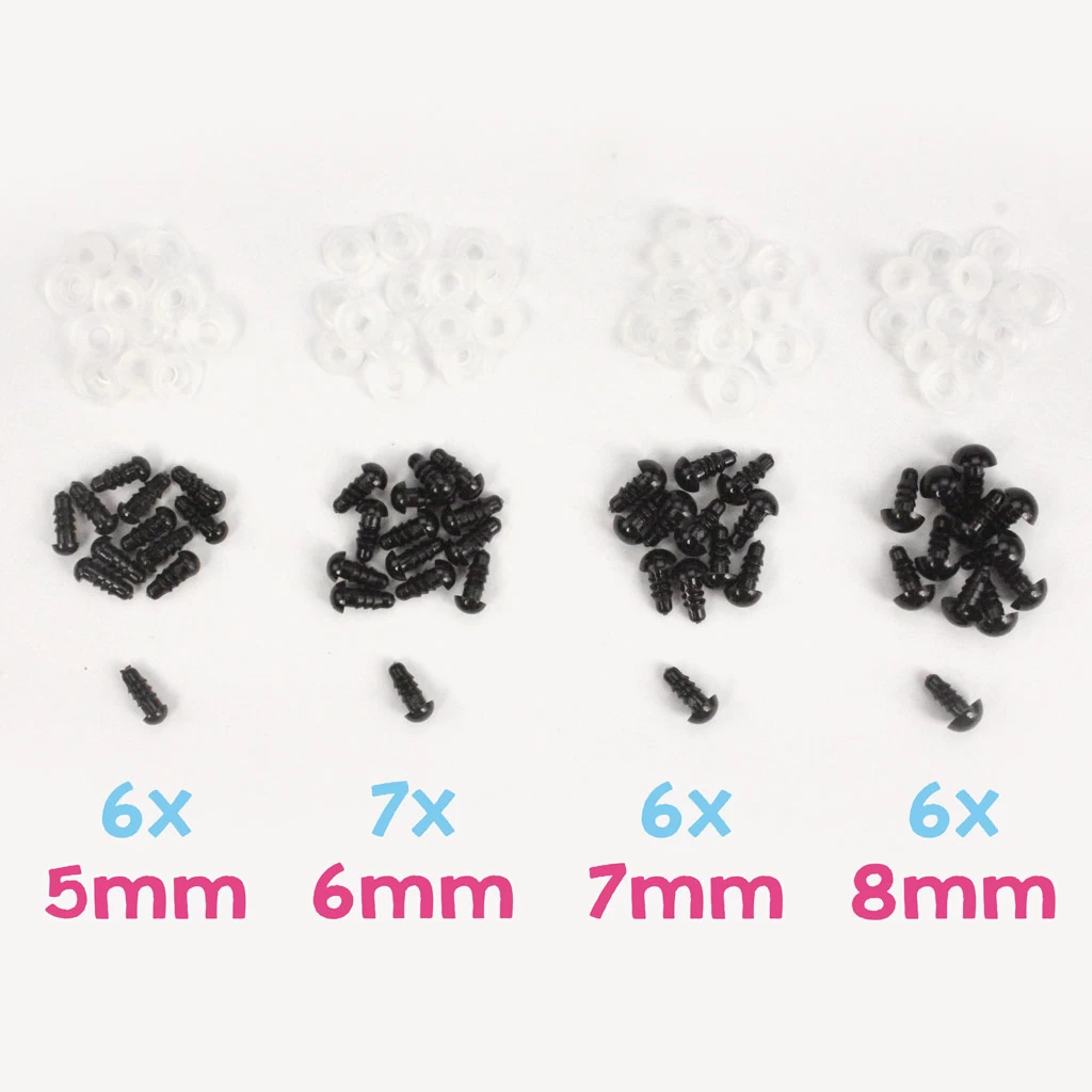 Eine Packung enthält 25 Sets von je 2 Sicherheitsaugen mit dazugehörigen Verschlüssen. Der Durchmesser der Sicherheitsaugen beträgt zwischen 5 und 8 mm. Alternativ haben wir auch ein Set mit nur 6 mm Augen für dich im Shop!