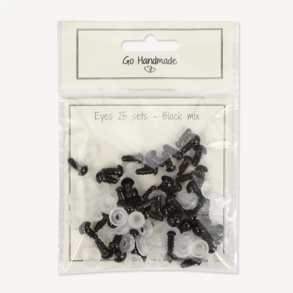 Das Sicherheitsaugen Set in schwarz vom dänischen Label Go Handmade ist perfekt geeignet für alle selbstgenähten Kuscheltiere und Amigurumi Figuren. Die Augen werden dabei durch den Trägerstoff gesteckt und von der Rückseite mit einer Steckscheibe befestigt. Die Steckscheiben sind vom Material her leicht flexibel und lassen sich dadurch leichter anbringen als oft verwendete harte Plastik- oder Metallsteckscheiben.