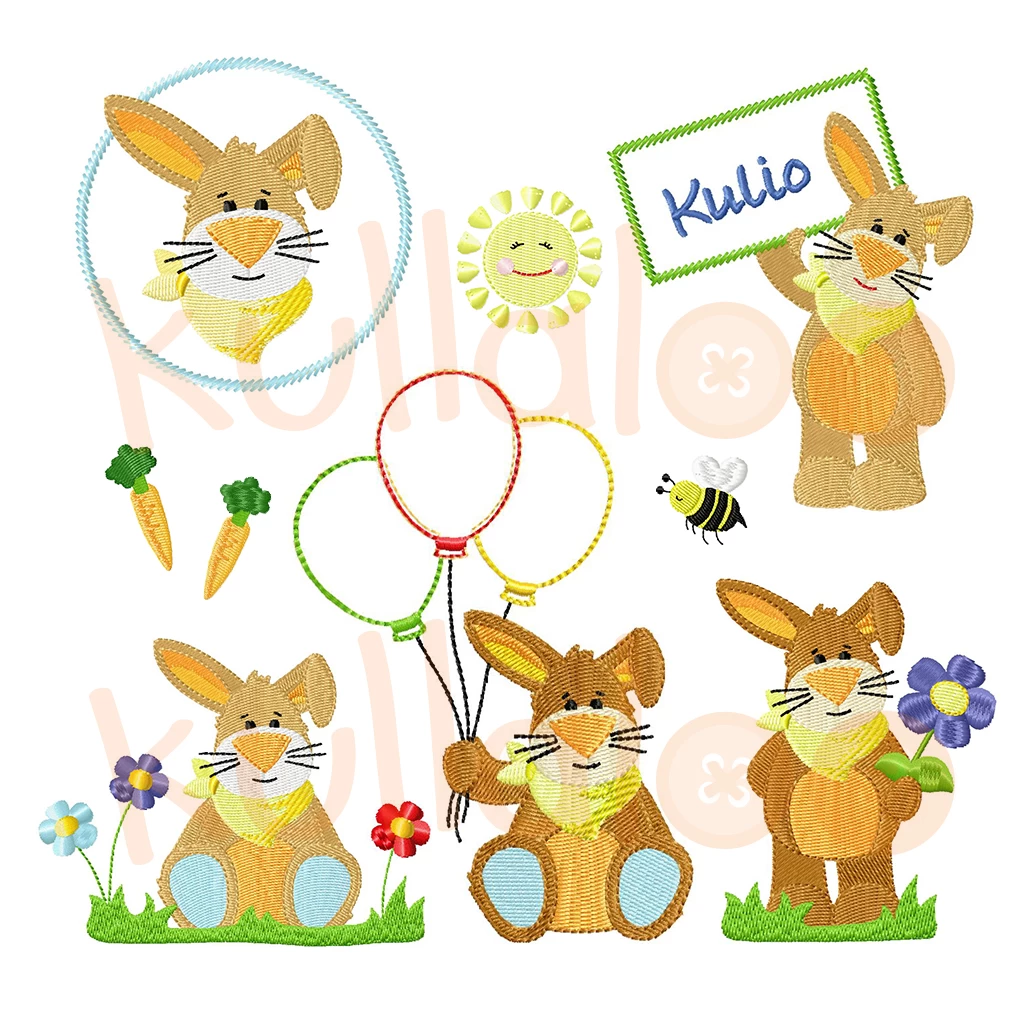 Mit dem Kauf erhältst du den Hasen „KULIO“ aus unserer Design-Serie „Kulio & the Gang – Basic“ im Set bestehend aus folgenden 10 Stickmotiv-Varianten für den 10×10 und 13x18cm-Rahmen: