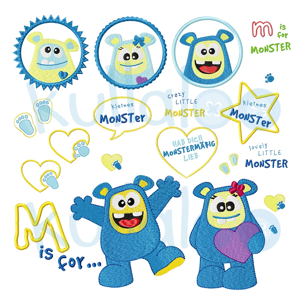 Mit dem Kauf erhältst du 41 Stickdateien aus unserer Design-Serie „Of Monsters & Mums – Basic“ im Set für den 10x10cm-Rahmen: