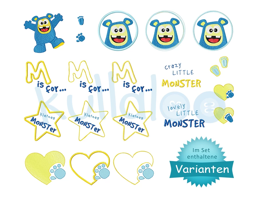 Mit dem Kauf erhältst du 20 Stickdateien aus unserer Design-Serie „Of Monsters & Mums – Basic“ im Set für den 10x10cm-Rahmen: