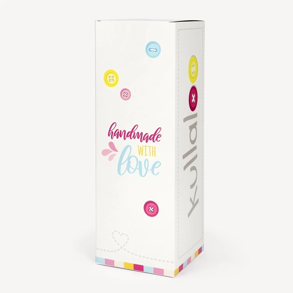 Die Geschenkschachtel erhält durch die stabile, beschichtete Pappe mit Seidenglanz-Optik einen tollen hochwertigen Look. Die Schachtel selbst kannst du oben durch eine Lasche öffnen und schließen. Bedruckt ist die Box im kullaloo Design mit bunten Knöpfen und dem Aufdruck „handmade with love“.