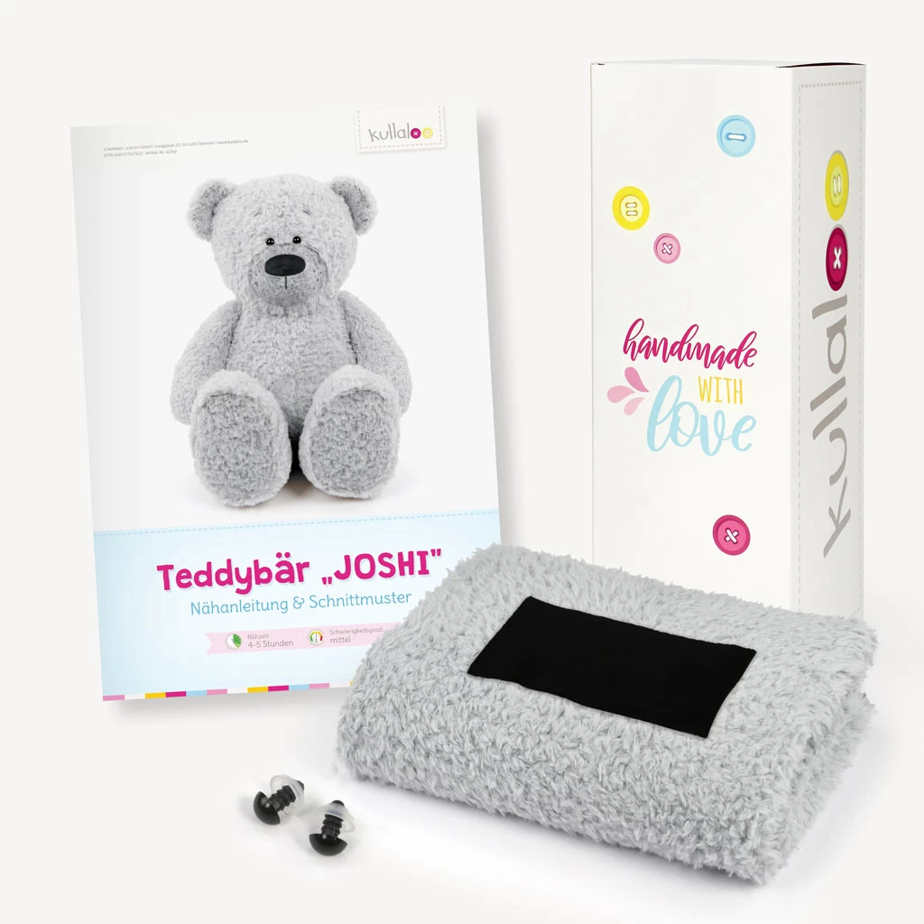 Super Geschenkidee für Nähfans: Mit diesem Set erhältst du unser Schnittmuster Teddy „JOSHI“ in gedruckter Form und passend dazu unseren Teddyplüsch FANTASTIC Furs ✶ Fine Teddy in hellgrau / helles silbergrau. Außerdem befindet sich ein kleines schwarzes Stoffstück im Set zum Applizieren der Nase und ein Paar schwarze Sicherheitsaugen aus Kunststoff. Das ganze ist verpackt in einer süßen Geschenkbox.