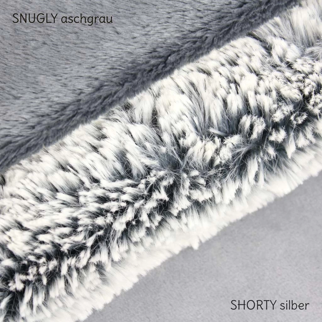 Beim Kombinieren mit Kurzhaarplüsch passt zum DIPY DYE Zottelplüsch in dunkelgrau / aschgrau am Besten unser SNUGLY aschgrau oder SHORTY aschgrau, aber auch unsere Plüschs in Silbergrau kannst du dazu super kombinieren!